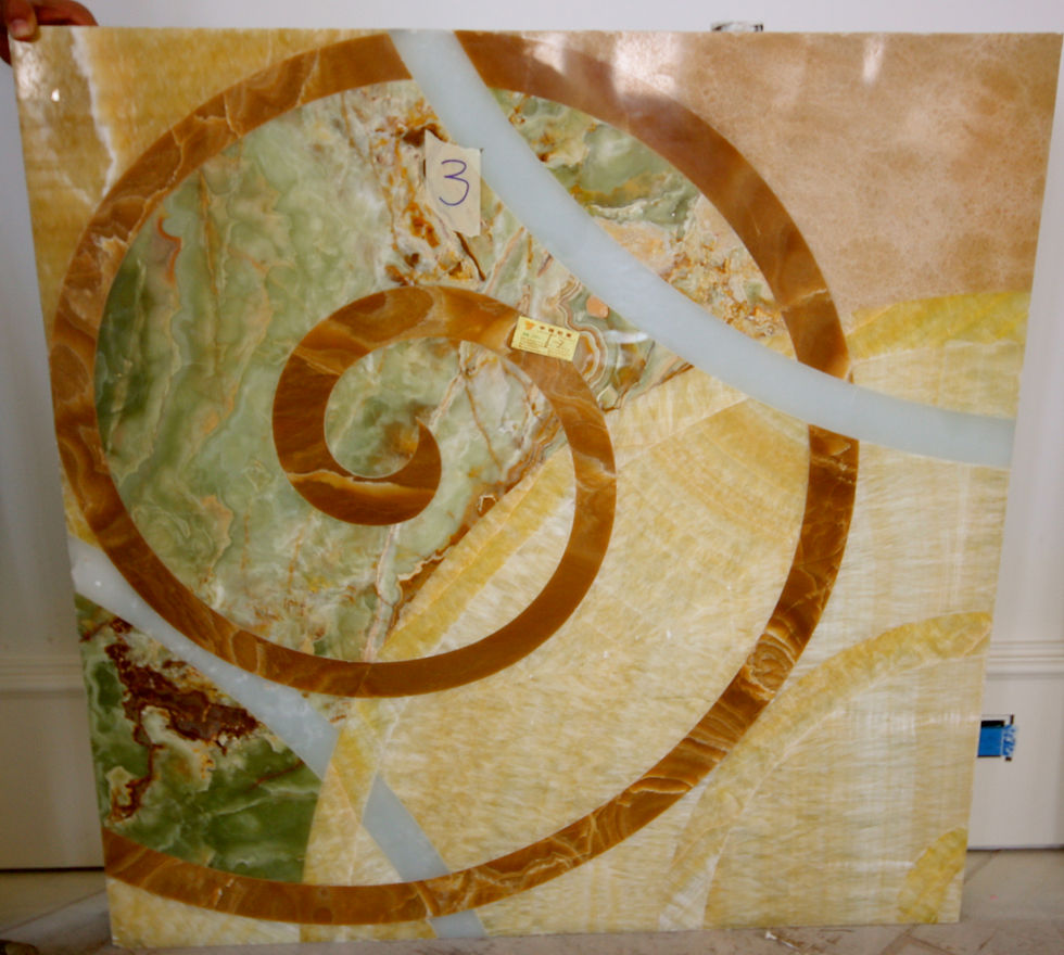 High-end waterjet custom design floor, medallion inlay, and backsplash created from natural stone, marble, onyx, or granite.